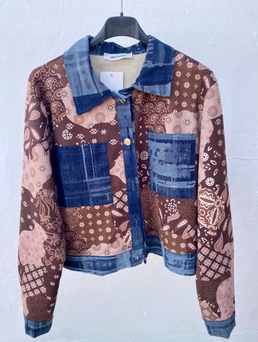 Cazadora piel antelina combinada con vaquero talla única. Talla desde la 36 a la 42